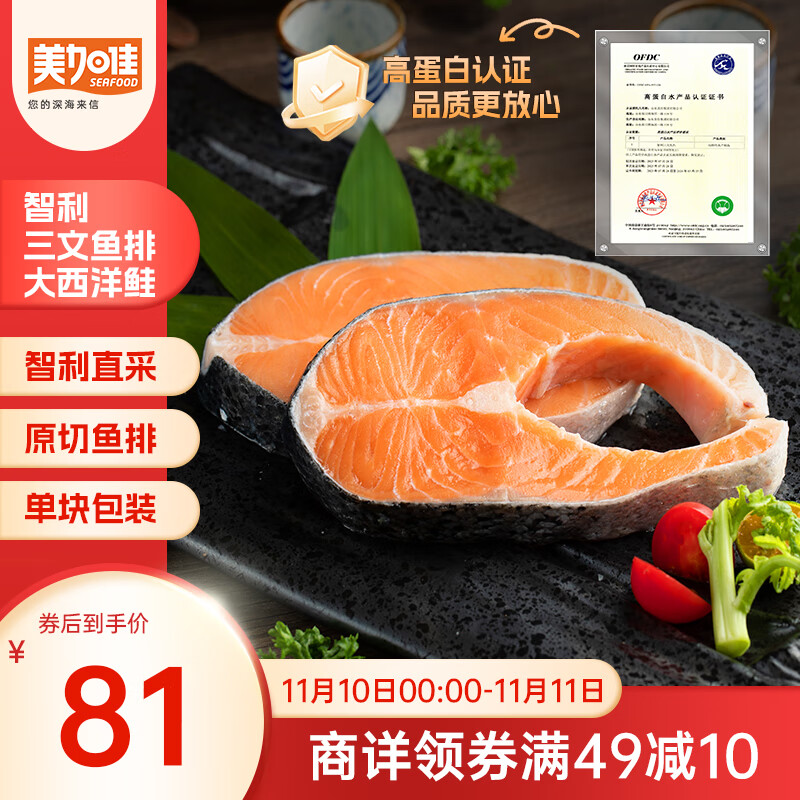 包邮 美加佳智利高蛋白三文鱼筒切(大西洋鲑)净重2斤(6-9袋)单块真空装